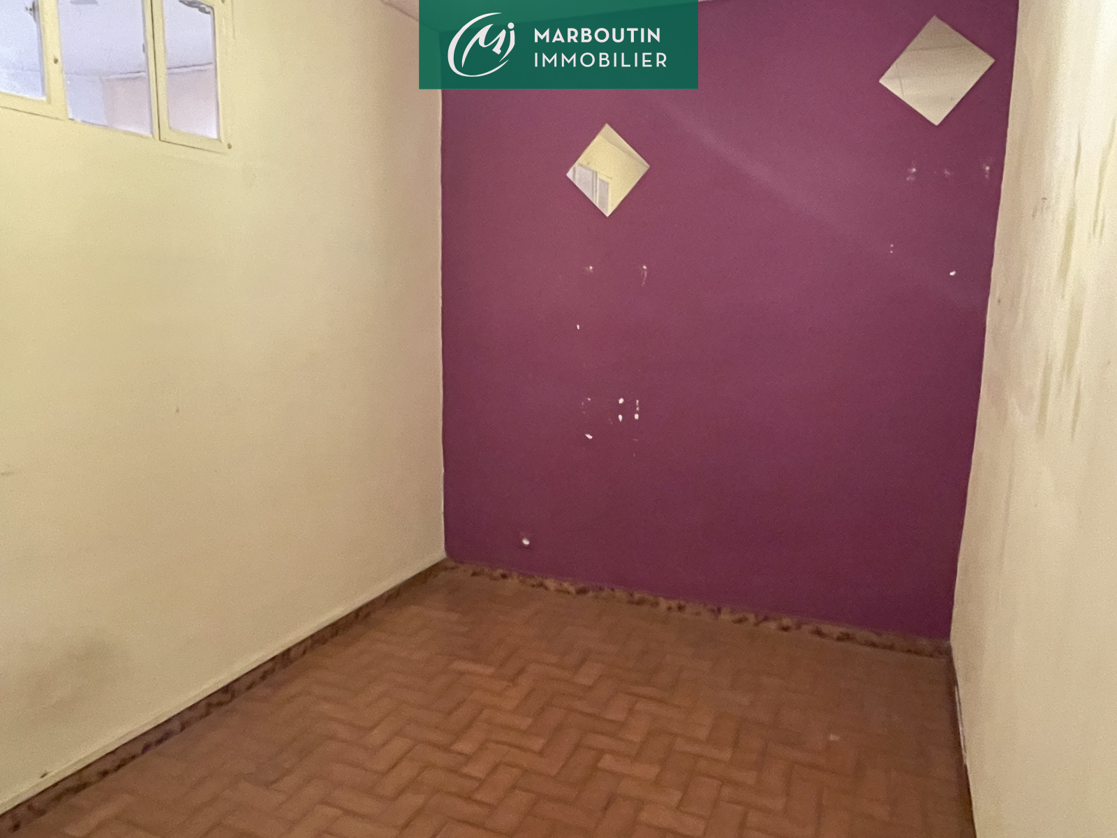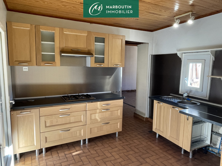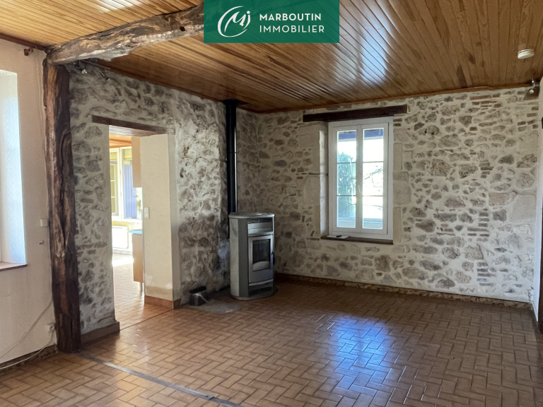 Au coeur du centre ville, maison en pierres de 94 m² entièrement de plain pied, à rafraichir, comprenant une entrée, un séjour de 24 m² avec poele à bois, cuisine ouverte et coin repas, 2 chambres, un bureau, une salle d'eau, un débarras et un wc.