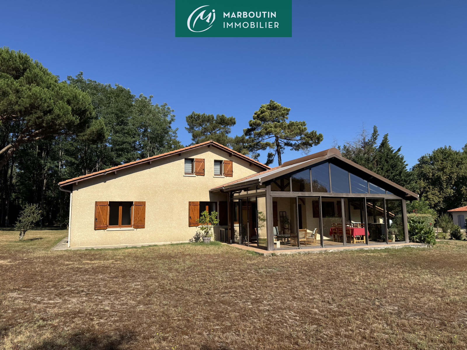 La maison dispose également d'une véranda plein Est de 40 m², d'un garage attenant à la maison et d'un atelier, l'ensemble se trouvant sur un terrain de 4 021 m² clos.