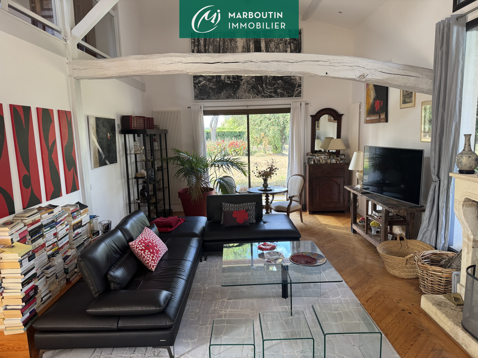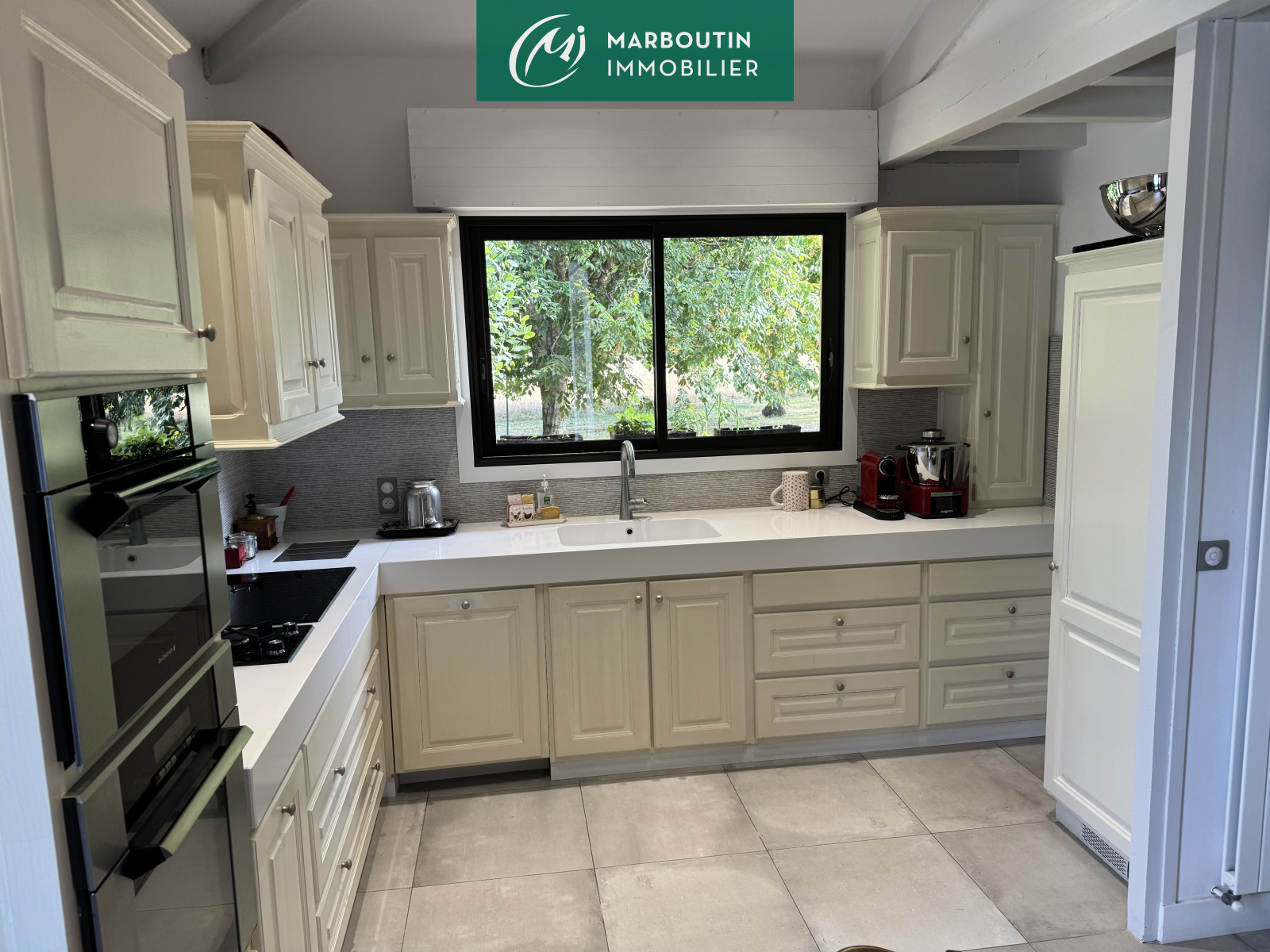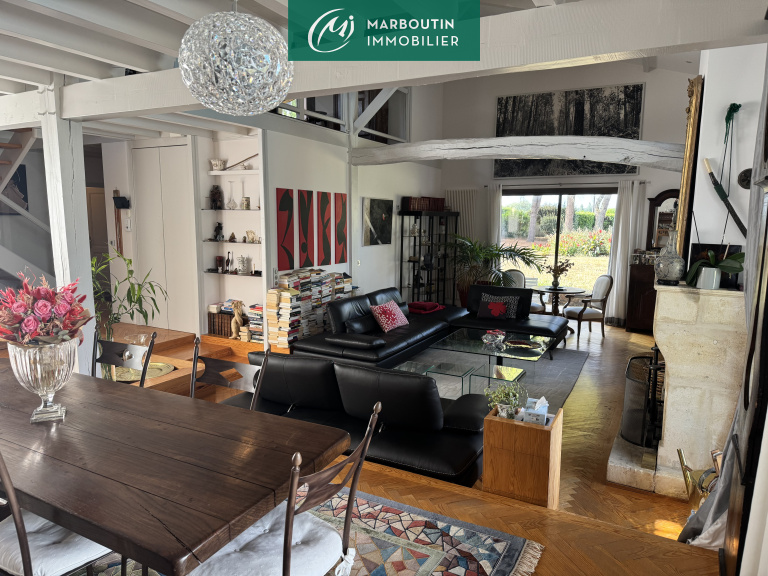 Aux portes de Casteljaloux, très belle maison de campagne de 240 m² habitables, composée en rez de chaussée d'une entrée ouvrant sur une grande pièce de vie de 63 m² avec cheminée foyer ouvert et toit cathédrale, nombreuses baies vitrées et ouvertures sur l'extérieur, une cuisine aménagée, un cellier, un couloir donnant sur un grande chambre parentale de 23 m² et salle d'eau privative, une chambre supplémentaire, une salle de bains et 2 wc.