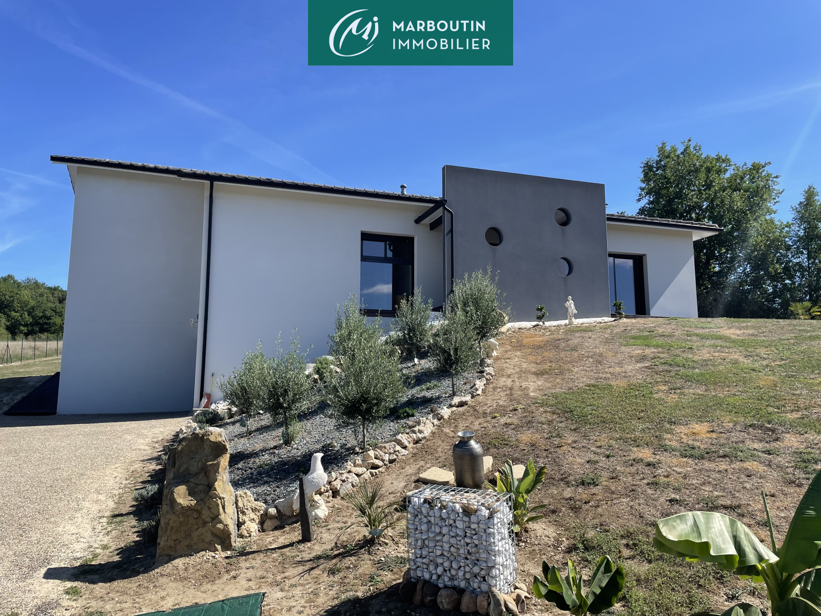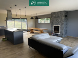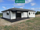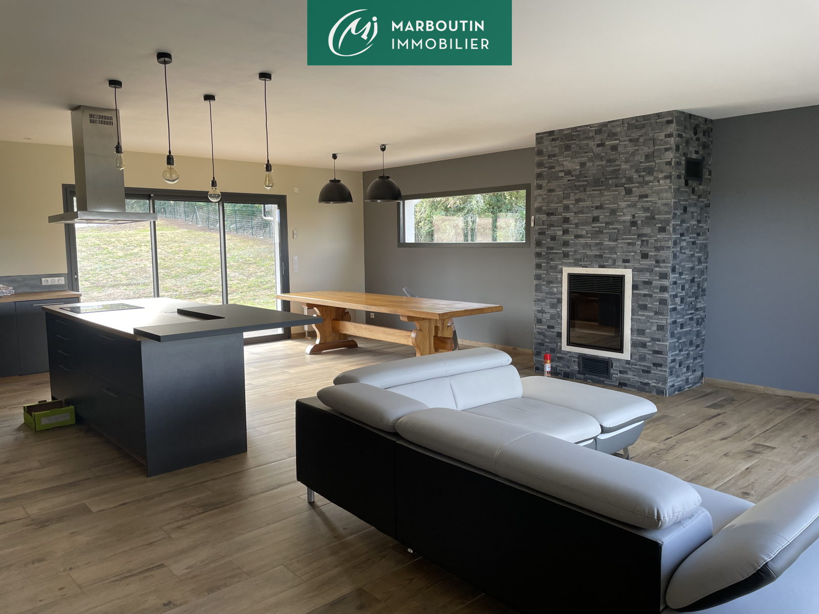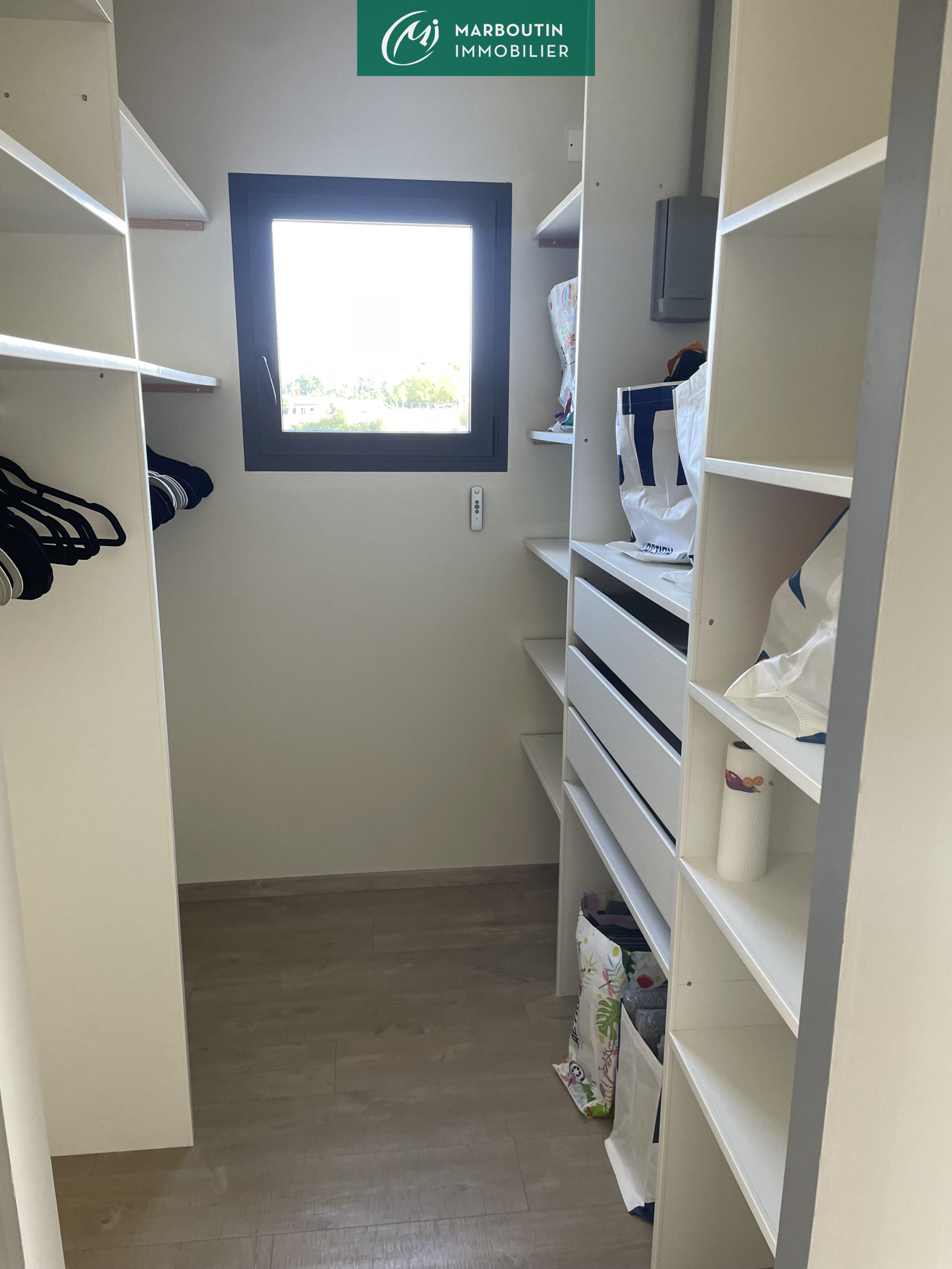 Belle villa contemporaine de 135 m² habitables construite en 2015, comprenant une grande pièce de vie avec cuisine américaine, un cellier, 3 chambres dont une suite parentale avec salle d'eau privée et dressing, une salle de bains et 2 wc.