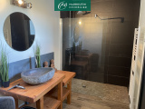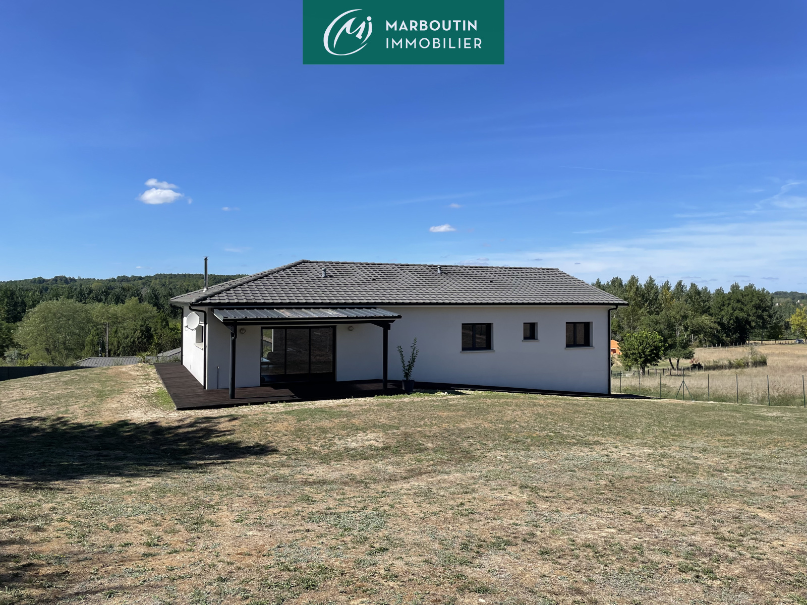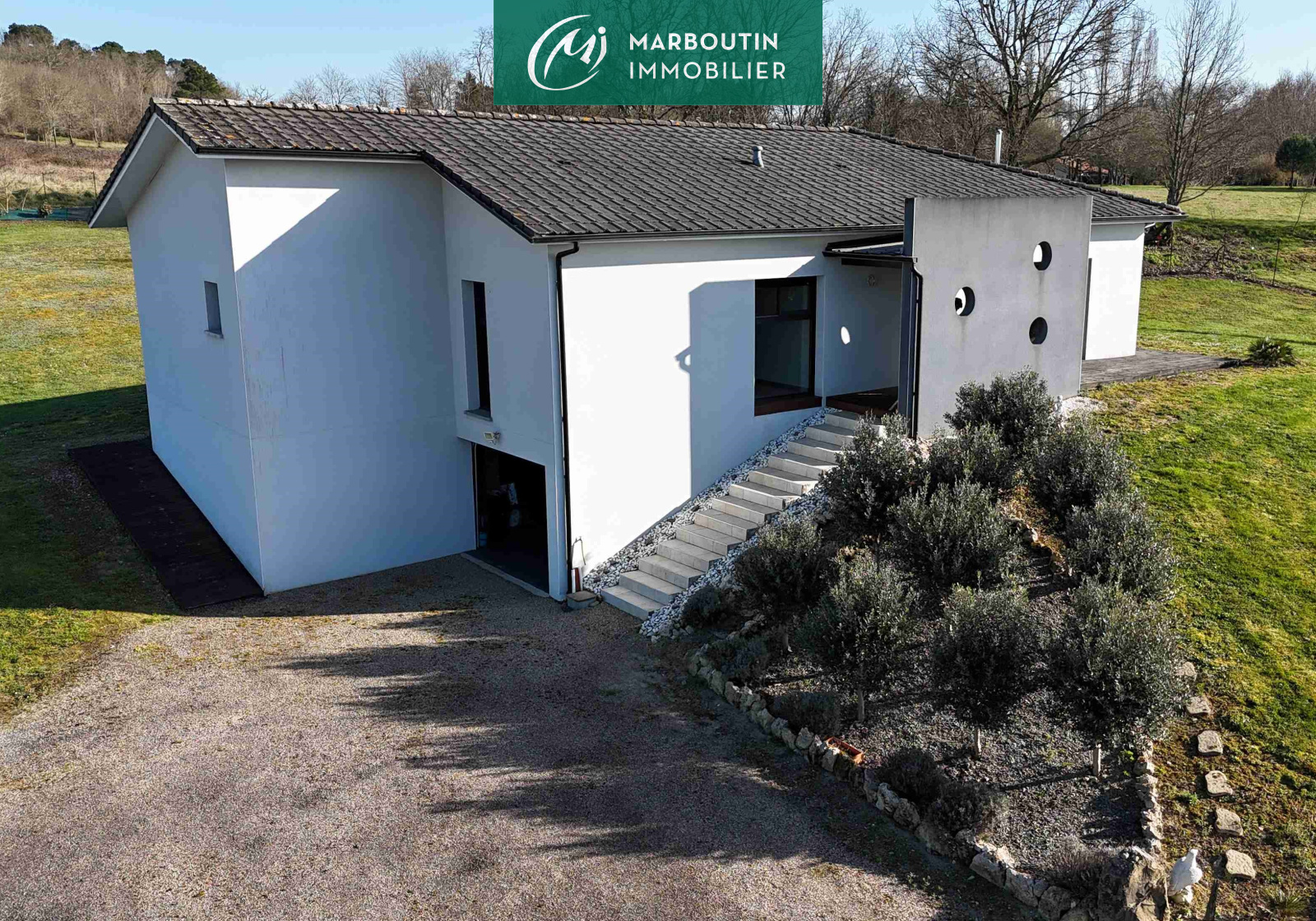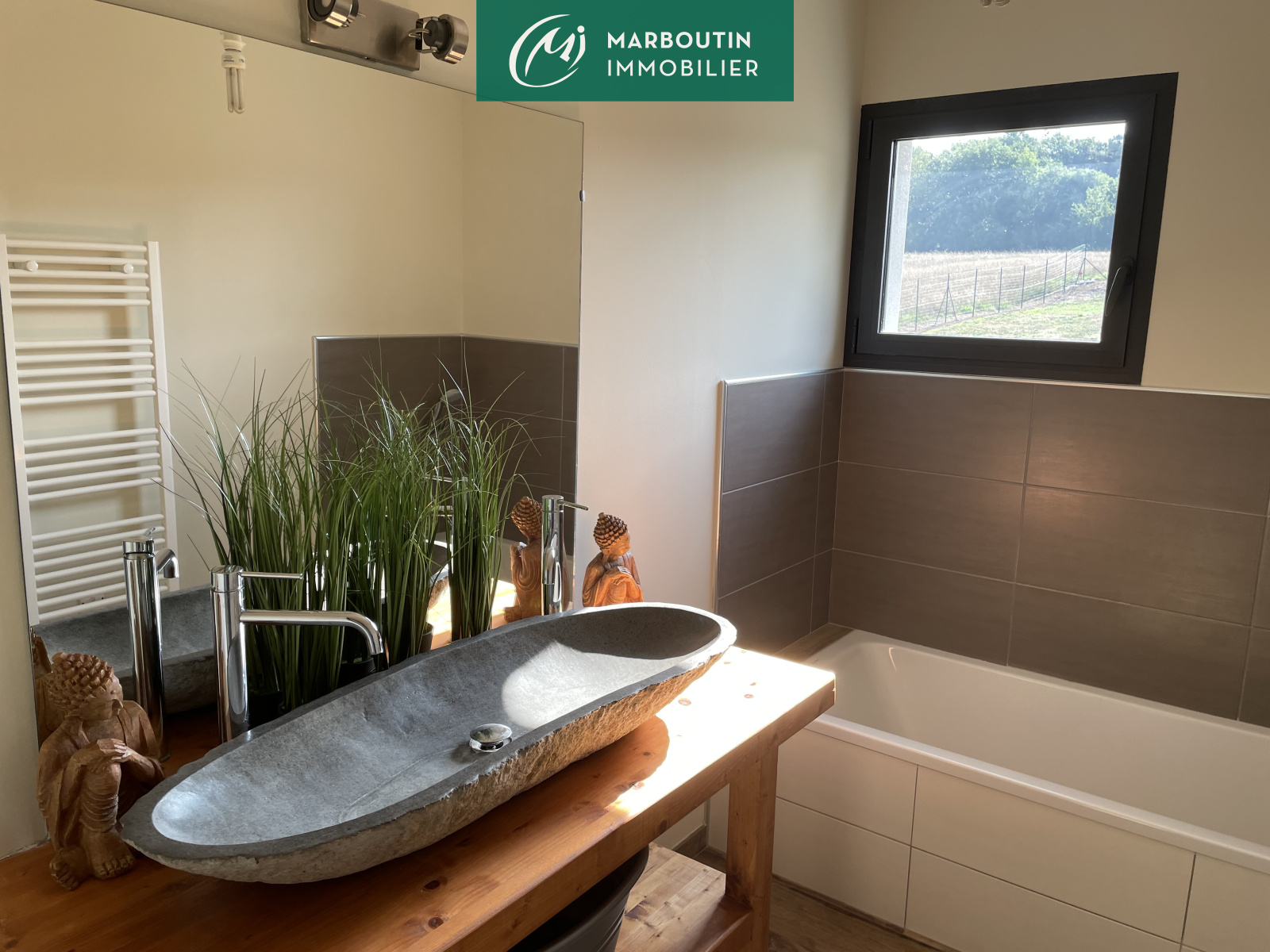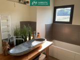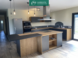 Belle villa contemporaine de 135 m² habitables construite en 2015, comprenant une grande pièce de vie avec cuisine américaine, un cellier, 3 chambres dont une suite parentale avec salle d'eau privée et dressing, une salle de bains et 2 wc.