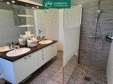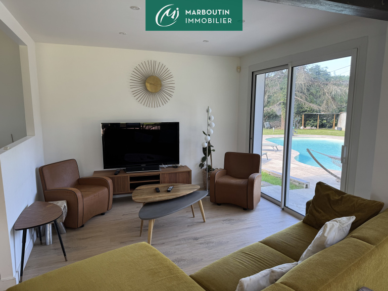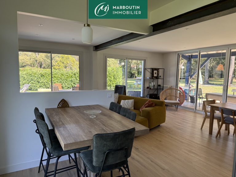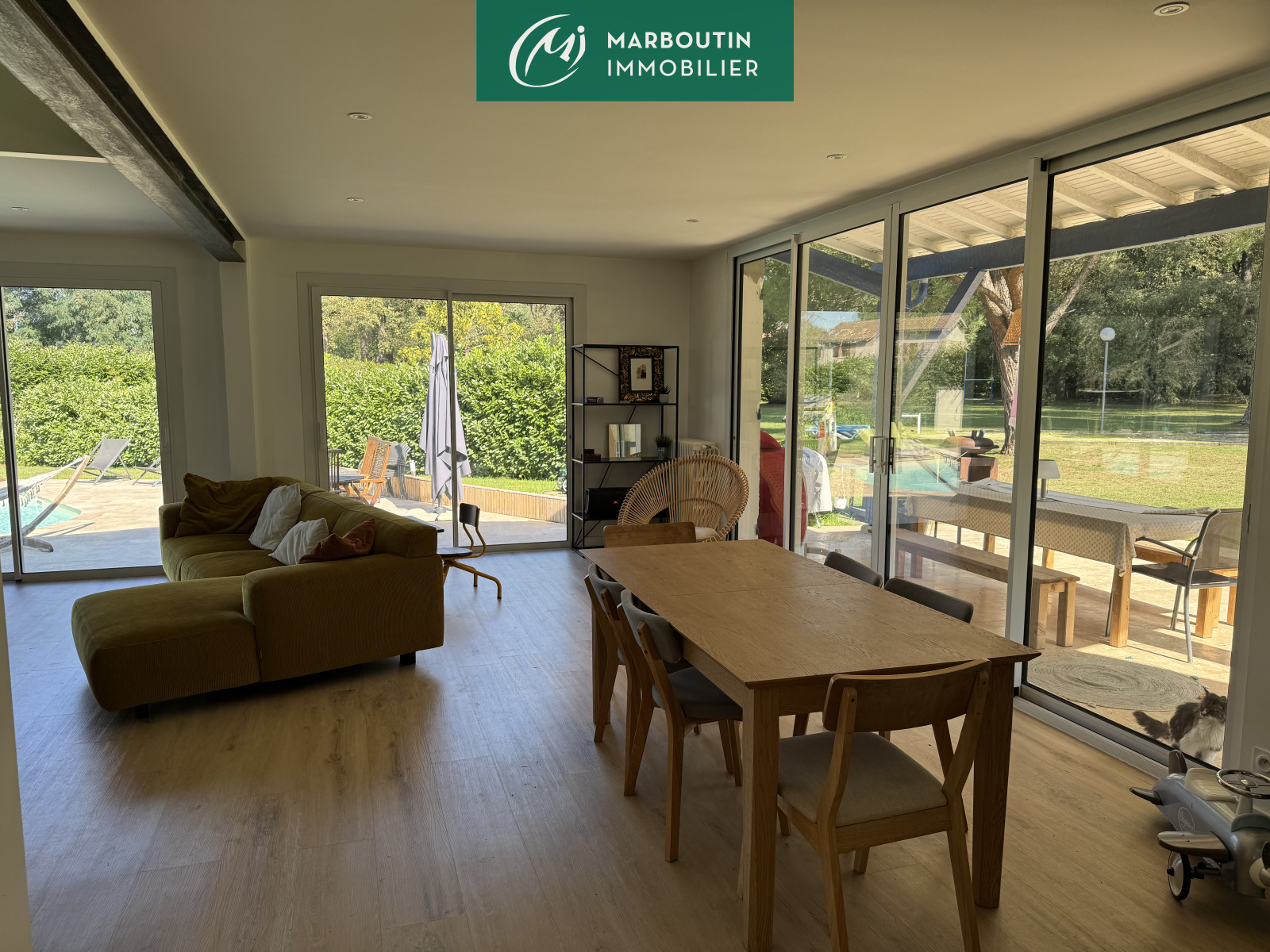 Belle villa contemporaine de 164 m² habitables, composée d’’une entrée de 17.5 m², d’une pièce de vie de 50 m² avec cuisine ouverte aménagée de 15 m², un couloir ouvrant sur 4 chambres, une salle d’eau et un wc. A l’étage se trouve une 5e chambre avec point d’eau. La maison dispose également d’un grand sous-sol de 71 m², de diverses terrasses, d’une piscine traditionnelle au sel, le tout se trouvant sur un parc clos de 8763 m².